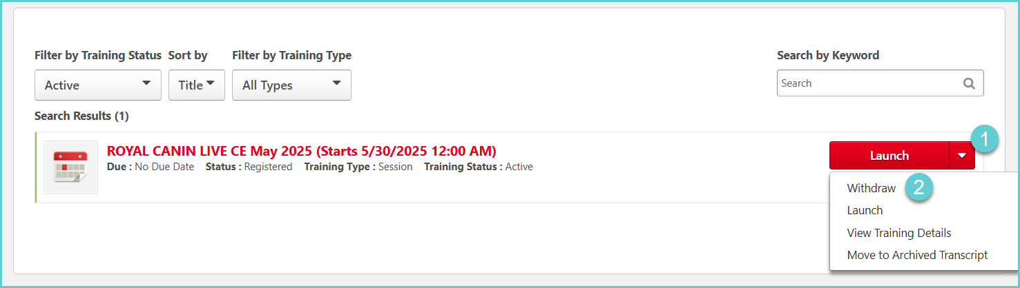 2. Locate the name of the training and select the downward-facing arrow (▼) next to the 'Launch' button to open a drop-down menu.