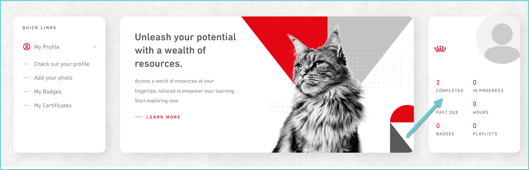 French Canadian SR Translation Pour télécharger ou imprimer une copie de votre relevé, veuillez suivre les étapes ci-dessous : 1. Sélectionnez l’option « Mon profil » sous « Liens utiles » sur la page d’accueil de l’Académie Royal Canin. Vous pouvez également accéder rapidement aux cours que vous avez terminés en cliquant sur « Complété » sous votre photo de profil et votre nom en haut à gauche de la page de bienvenue. 3. Cliquez sur l’icône d’ellipse (…) dans le coin supérieur droit de votre relevé. |
